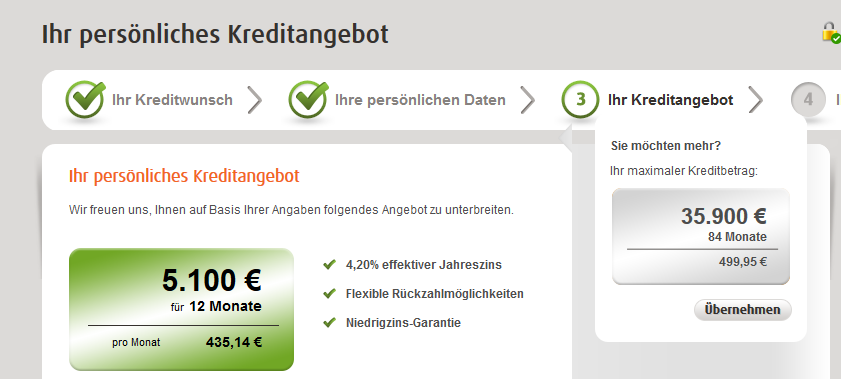 Im Rechner, in dem ihr euren Wunschbetrag und eure Laufzeit eintragt, bekommt ihr ein Angebot angezeigt, das auf 2,9% eff. Jahreszins beruht. In der Antragsstrecke selbst, die ihr durchlaufen müsst, wird euch aber erst das abweichende individuelle Angebot unterbreitet, dabei kann der effektive Zinssatz (und damit der absolute Zinsbetrag) vom Angebot aus dem Rechner abweichen (je nach Bonität eurerseits). Die jeweiligen individuellen Bedingungen ergeben sich aus dem Antragsprozess.