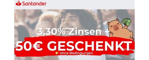 WOW!!! 💸 50€ Bonus NUR FÜR DIE ERÖFFNUNG! 🤯 3,30% Zinsen p.a.! Komplett kostenlos! 🚀 Santander Tagesgeldkonto! 🥳 keine Schufa!