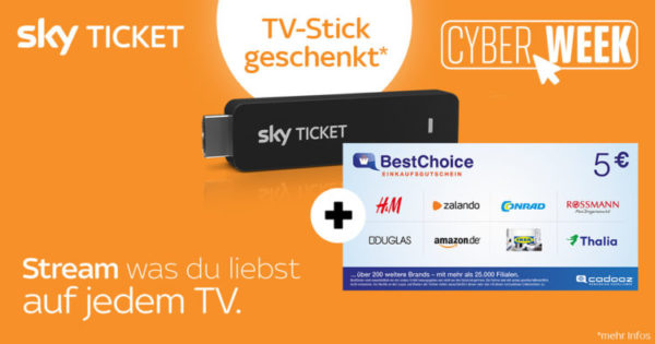 Sky Ticket Cyber Week: Stick im Wert von 29,99€ gratis auf alle Tickets ab 9,99€ + 5€ Bonus