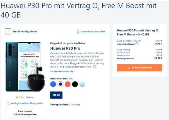 - Huawei P30 Pro für 49€ + o2 Free M Boost (40GB LTE) für 34,99€/Monat