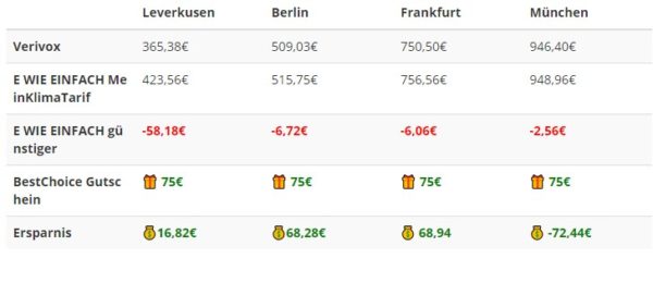 Gerade das Angebot mit Gas (bei E WIE EINFACH klimaneutral) kostet ihr momentan nur wenige € mehr als der günstigste Anbieter am Markt.