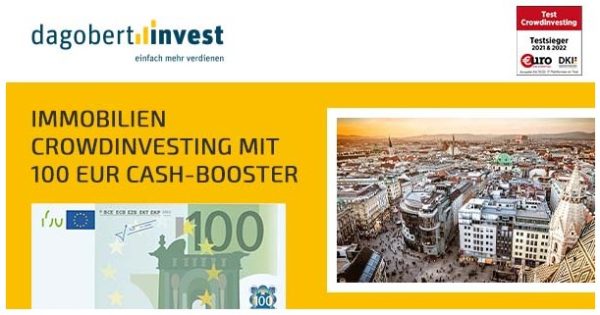 Wenn ihr jetzt in eines der dagobertinvest Immobilienprojekte investiert, erhaltet ihr nach Ende der Rücktrittsfrist von 14 Tagen 100€ retour auf euer hinterlegte Referenzkonto erstattet! Außerdem bekommt ihr am Ende der Laufzeit euren Investitionsbetrag und Zinsen von 7-10% p.a. (je nach Projekt) wieder zurück.