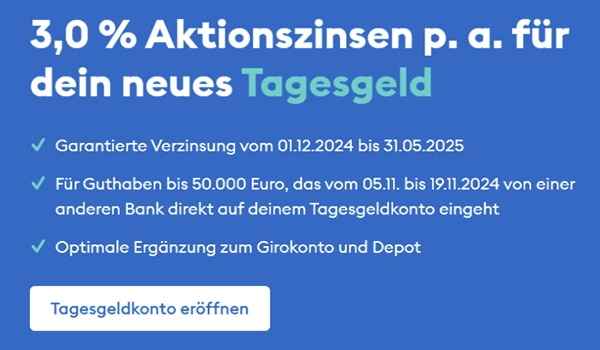 Für alle Beträge bis 50.000€, die bis zum 19.11.2024 eingehen, gelten ab dem 01.12.2024 für sechs Monate die Aktionszinsen. Alle anderen Einlagen auf dem Tagesgeldkonto werden gemäß dem aktuell gültigen Preis- und Leistungsverzeichnis Sparprodukte verzinst.