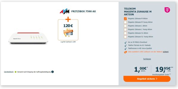 *120€ CASHBACK* Telekom Magenta Zuhause M / L / XL + FRITZ!BOX 7590 AX für 1€