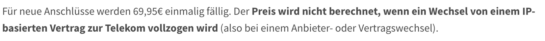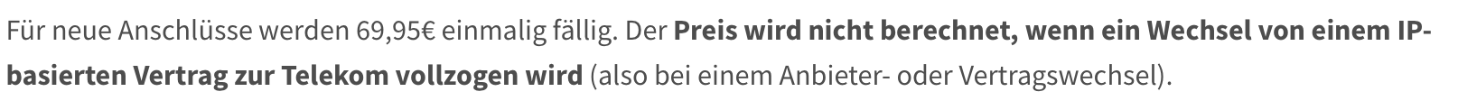 Für neue Anschlüsse werden 69,95€ einmalig fällig. Der Preis wird nicht berechnet, wenn ein Wechsel von einem IP-basierten Vertrag zur Telekom vollzogen wird (also bei einem Anbieter- oder Vertragswechsel).