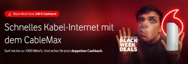 Gigabit-Internet, doppeltes Cashback und auf Wunsch gleich noch Kabel-TV dazu, mit dem Vodafone GigaZuhause CableMax 1000 könnt ihr euch zur Black Week ein ziemlich rundes Paket sichern.