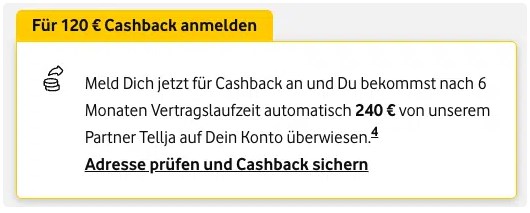 - mit 240€ Cashback statt 120€ (nach 6 Monaten Vertragslaufzeit über Tellja)
