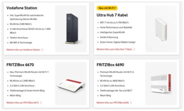 Die günstigste Option ist die Vodafone Station für 3,99€/Monat, mit Wi-Fi 6, SuperWLAN-Optimierung und solider Performance für typische Haushalte.
