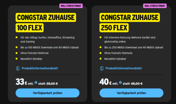 Bis zum 08.12.2025 gibt es bei Congstar die congstar DSL: Zuhause Tarife (100 Mbit/s & 250 Mbit/s) ab 33€/Monat mit 0€ Bereitstellung & 0€ Router-Miete!