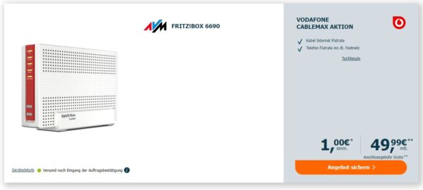 FritzBox 6690 + Vodafone Cable Max (1.000 Mbit/s) für 49,99€/Monat – eff. 38,88€/Monat