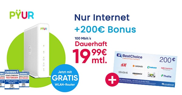 PYUR (bzw. korrekterweise: PŸUR) bietet günstige Internet-Tarife über Glasfaser und Koaxialkabel an, mit der Besonderheit, dass ihr aktionsbedingt dauerhaft bis zu 45% weniger zahlt – den 250er gibt es so z.B. bereits ab 24,99€ mtl.! Und über diesen Bonus-Deal könnt ihr euch dazu noch einen BestChoice- oder Amazon.de-Gutschein im Wert von 200€ als MonsterDealz-Bonus sichern.