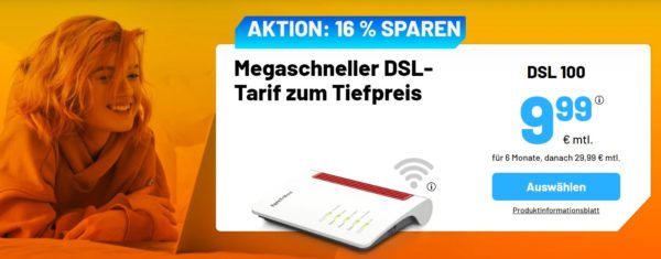 - DSL 100 mit (bis zu 100 Mbit/s Download, bis zu 40 Mbit/s Upload) für 29,99€/Monat – Die ersten 6 Monate nur 9,99€/Monat