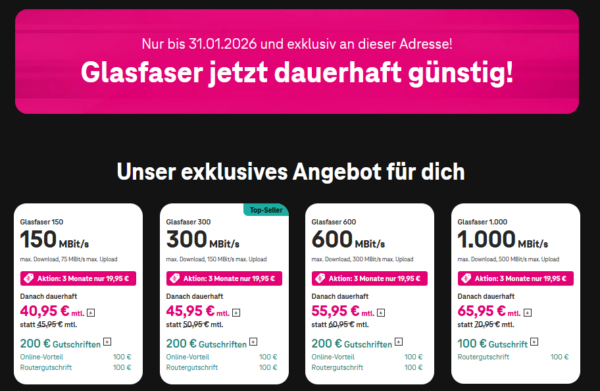*PERSONALISIERT* Telekom Glasfaser-Angebote (5€/Monat Rabatt + 200€ Gutschrift + v.m.)