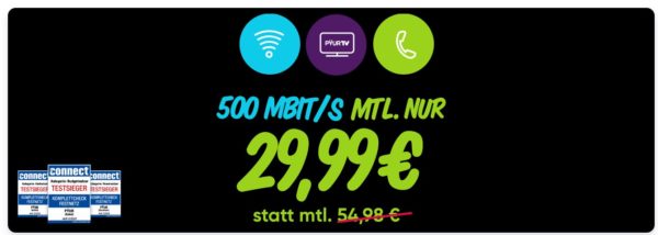 - Bis zu 500 Mbit/s Download & bis zu 25 Mbit/s Upload für 29,99€/Monat (statt 55€)