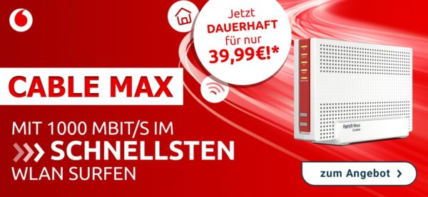 Vodafone Cable Max 1000 inkl. FRITZ!Box 6690 + 50€ Amazon Gutschein* (1€) dauerhaft für 39,99€/Monat – auch nach 24 Monaten