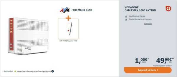 Vodafone Cable Max 1000Mbit/s + 175€ Onlinebonus + Fritz!Box 6690 + Repeater 2400 für 49,99€/Monat – eff. 27,87€/Monat