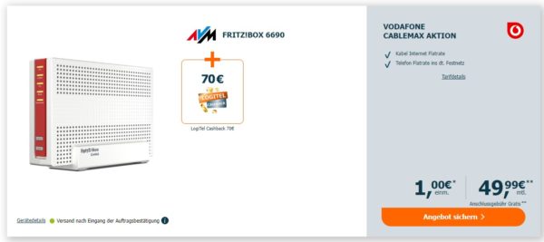 Bei LogiTel bekommt ihr den Vodafone Cable Max 1000Mbit/s mit FritzBox 6690 & 70€ Cashback für 49,99€/Monat