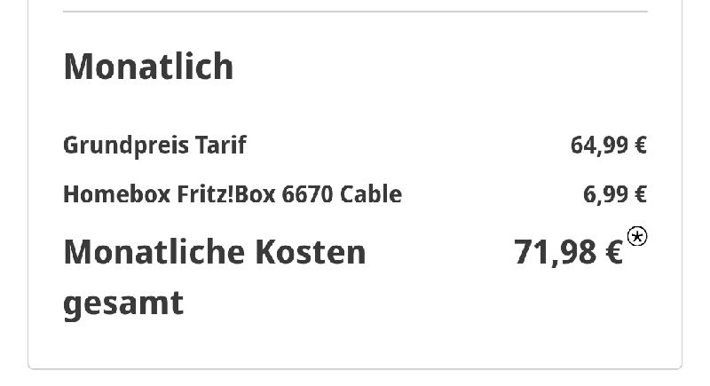 JasonLA 17.02.2026, 16:24 #da muss man ein wenig aufpassen was die Gebühren nach den 24 Monaten betrifft. Der 1000er Anschluss kostet eigentlich ~50€ und nicht 65€ im Vergleich zum Angebot https://www.monsterdealz.de/finanzen-sparen/festnetzvertraege/vodafone-gigazuhause-cablemax-bis-1-000-mbit-s-inkl-fritzbox-6670-cable-alles-flat-fuer-eff-3084e-monat-dank-300e-cashback/1489078