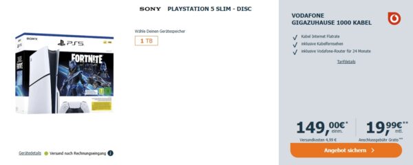 Vodafone GigaZuhause 1000 Kabel + PlayStation 5 Slim (DISC) Fortnite Cobalt Star Bundle für eff. 14,57€/Monat 🚀