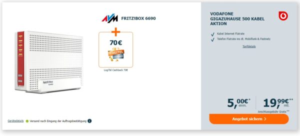 Schönes Angebot von LogiTel, dort bekommt ihr den Vodafone GigaZuhause Kabel 500 inkl. Fritzbox 6690 + 120€ Bonus + 70€ Cashback für 49,99€/Monat