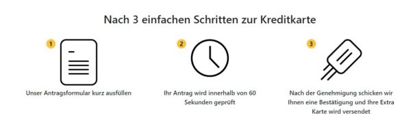 - Das geht ganz einfach: Ihr füllt ein Formular mit euren persönlichen Informationen aus und schickt es ab. Euer Antrag wird innerhalb von 60 Sekunden geprüft und ihr bekommt eine E-Mail mit den Details zu eurem Kundenkonto für die Extra Kreditkarte.