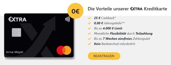 Die Extra Karte ist eine Kreditkarte ohne Jahresgebühren, bietet flexible Zahlungen und weltweite Zahlungsmöglichkeiten.