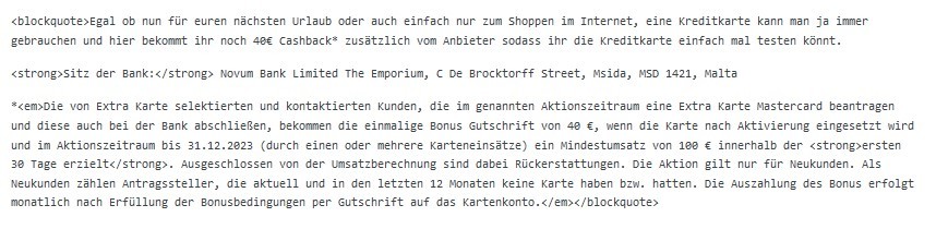 ja gibt Alternativen, aber es gibt auch andere Kunden die eben noch nicht alle Kreditkarten durch haben, oder sich das Produkt anschauen wollen. Bank mit Sitz in Malta hat die gleichen EU-Rechte/Pflichten. Der Unternehmensitz sollte in der heutigen Zeit nichts mehr ausmachen. Die Bank/KK/Anbieter hat sich bewährt und ist intern von uns geprüpft worden und wir haben direkten Kontakt. Wenn etwas mit der Prämie schief gehen sollte, schickt mir gerne persönlich eine E-Mail. 🙂