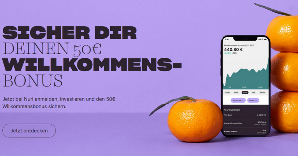 Für Neukunden gibt es momentan einen 50€ Bonus wenn das kostenlose Nuri Girokonto eröffnet wird (schufafrei!) und ihr für mind. 30€ Bitcoin oder Ether kauft oder die erste Krypto Sparplan Rate über mind. 30€ eingezogen wird.