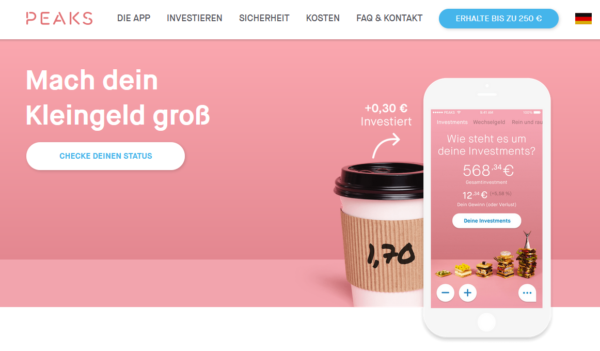 Peaks.com ist eine App mit der man in Indexfonds investiert. Ihr investiert je nach Risikobereitschaft gemischt in Aktienfonds oder Anleihefonds.