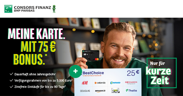 Richtig gut! Ihr bekommt zur Consors Finanz Mastercard aktuell den Rekordwert von einem 75€ Bonus!