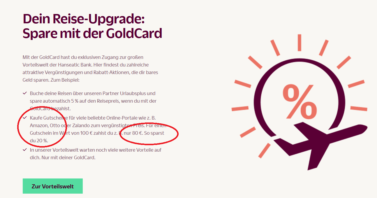Mit der GoldCard hast du exklusiven Zugang zur großen Vorteilswelt der Hanseatic Bank. Hier findest du zahlreiche attraktive Vergünstigungen und Rabatt-Aktionen, die dir bares Geld sparen. Zum Beispiel: