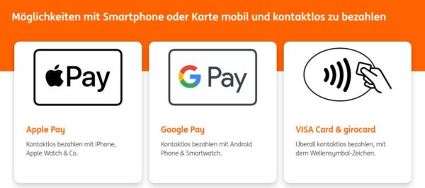 Kunden können weiterhin mit einer kostenlosen Visa-Debitkarte bezahlen, die jedoch in kleineren Geschäften und in ländlichen Gebieten oft nicht akzeptiert wird. Wer Geld auf sein ING-Konto einzahlen möchte, benötigt zwingend eine Girocard. Gebührenfreie Abhebungen an allen Geldautomaten sind jedoch nur mit der kostenfreien Debitkarte möglich.