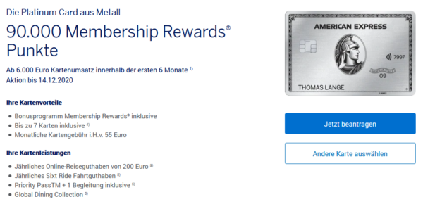 - Gültig für Privatkunden – Selbstständige klicken hier: Bis zu 200.000 Membership Rewards Punkte (American Express Business Platinum Card)