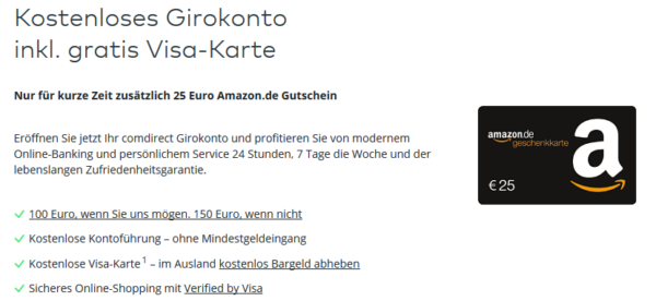 - comdirect Girokonto eröffnen und bis zu 150€ Prämie + 25€ Amazon.de Gutschein erhalten (Direktlink) (Beitrag)