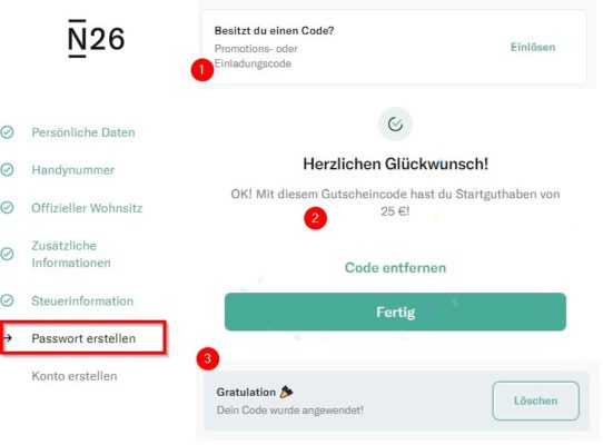 Das Wichtigste: Den Promocode: GIROKONTO2023 am Ende der Kontoeröffnung im Schritt „Passwort erstellen“ eintragen, das geht in den drei unten gezeigten Schritten.
