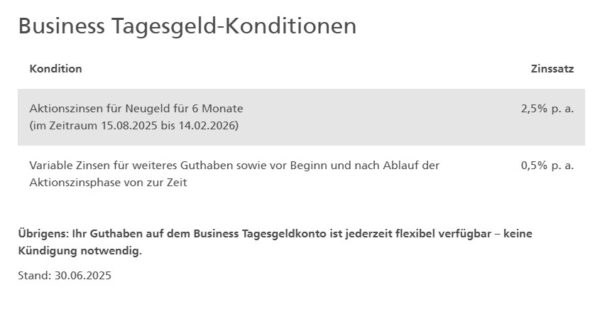 - Aktionszinsen für Neugeld für 6 Monate (im Zeitraum 15.08.2025 bis 14.02.2026): 2,5% p.a.
