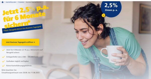 Da die Tagesgeld-Deals bei euch sehr beliebt sind, könnte der folgende auch genau passend für euch sein, diesmal für die Business-Kunden unter euch, bei der Postbank ist eine Business-Tagesgeld-Neugeld-Aktion mit 2,5% Zinsen p.a. für 6 Monate gestartet.
