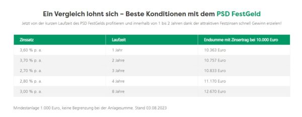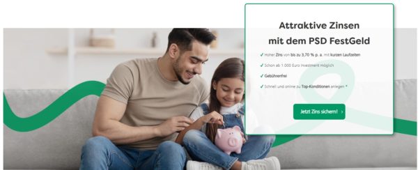 PSD Bank: Festgeld bis zu 3,70% Zinsen p.a. (schon ab 1.000€, keine Gebühren)