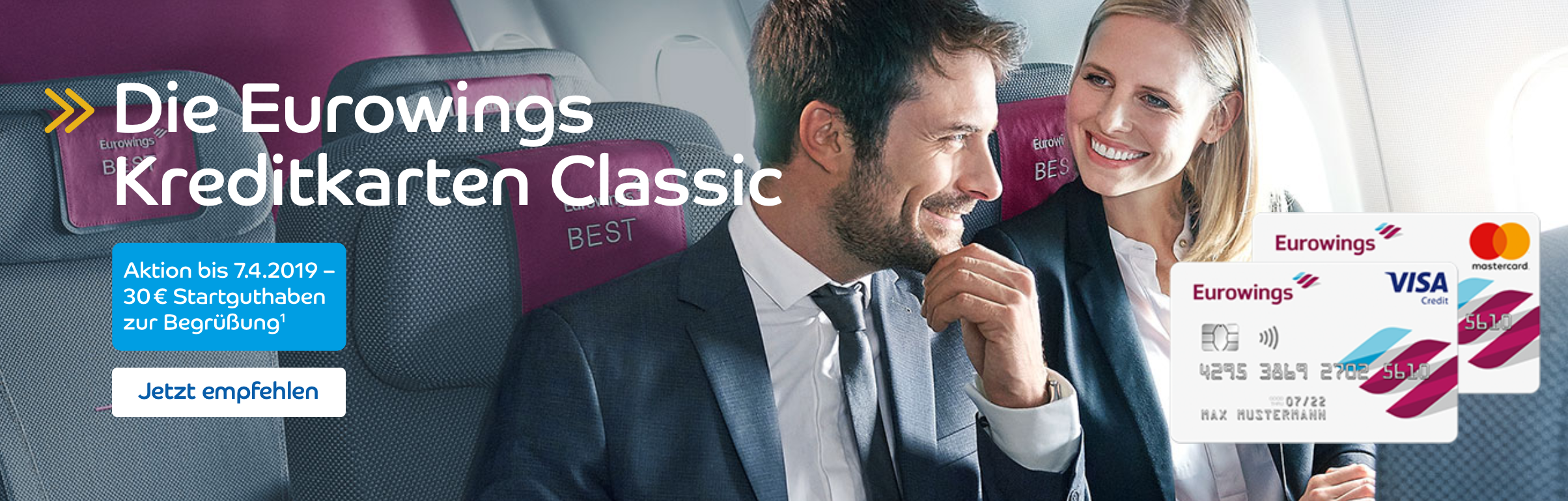Matthi 27.03.2019, 08:20 #Für die Eurowings Kreditkarten Classic könnt ihr bis zum 07.04. 30€ Startguthaben erhalten. Lasst euch die Karten einfach empfehlen: https://www2.barclaycard.de/eurowings_freund/?tab=classic