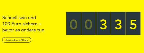 - Die 100 Euro Bonus erhalten Kunden, wenn sie innerhalb der ersten drei Monate nach Kontoeröffnung mindestens drei mobile Transaktionen mit der comdirect Visa-Karte über Apple Pay oder Google Pay tätigen (ohne Mindestbetrag, ab 0,01 Cent). Die Prämie schreibt comdirect im vierten Monat nach Kontoeröffnung auf dem neuen Girokonto gut. Der Countdown zeigt die noch verfügbaren Girokonto-Anträge für diese Aktion an. Für die Teilnahme an der Aktion muss das Konto bis 30.11. eröffnet sein. comdirect behält sich Änderungen oder eine Beendigung des Angebotes jederzeit vor.