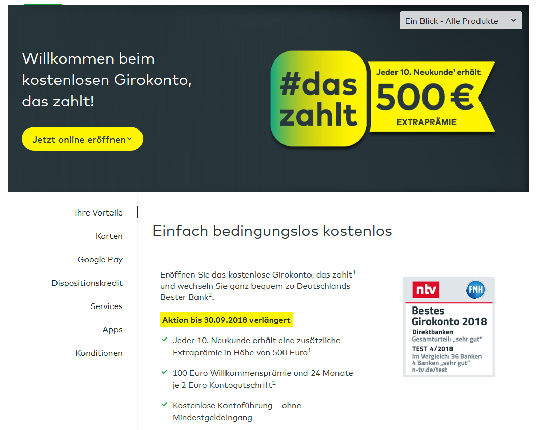Gast (Gast) 14.09.2018, 17:17 # hilfreichDas Angebot wurde bis 30.09.2018 verlängert – und mit Glück (…) kann man noch zusätzlich 500 Euro gewinnen… Jede 10. Eröffnung bekommt diese zusätzliche Prämie…