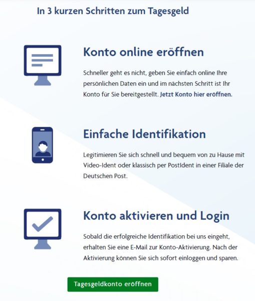 Wichtig zu beachten ist, dass es sich bei dem Tagesgeldkonto um ein reines Onlinekonto handelt. Die Kontoeröffnung und -führung erfolgen ausschließlich über das Internet.