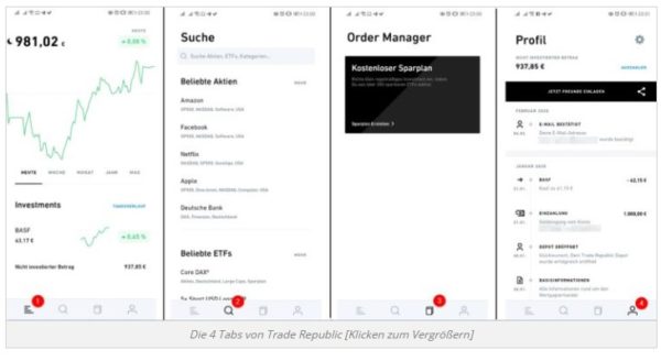 Es gibt in der sehr einfach aber funktional gehaltenen Trade Repubic App quasi 4 Tabs unten, die ich im Screenshot mit den roten Zahlen 1 – 4 markiert habe.
