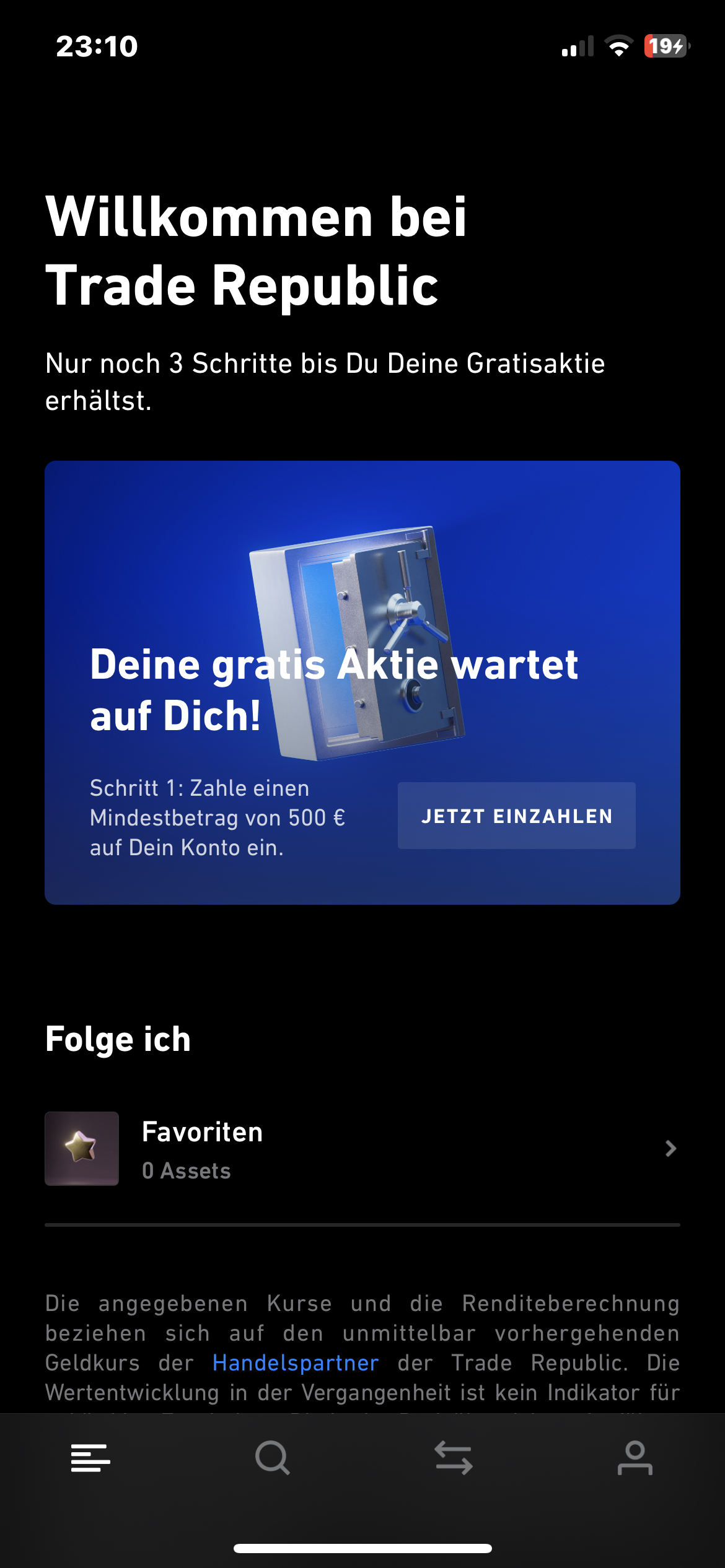 Wow, was für ein Börsenumfeld seit dem Trade Republic 2019 gestartet ist – mehr auf und ab ist kaum möglich! Habt ihr auch in den vergangen 3 Jahren noch immer nicht Trade Republic getestet? Dann habt ihr nun die Möglichkeit eine Aktie (bzw. Aktienbruchstück) im Wert von 25€ geschenkt zu bekommen. Diese 25€ sind garantiert – es gibt also keine Enttäuschung mit „bis zu“, wie bei den letzten Aktionen, die sich dann als 5-10€ Wert entpuppten. Traden könnt ihr weiterhin zu 0€ Orderentgelt und 1€ Fremdkostenpauschale, besser geht es eigentlich kaum noch!