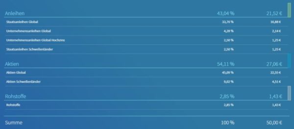 Mit den Werten kann man weiter rumspielen, um zu lernen, was man hier abschließt. Es gibt außerdem noch eine Detailauswertung der einzelnen Anlageprodukte der Strategie: