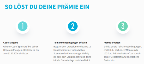 - Bedingung: 12 Monate Sparplan (ab 25€ mtl. möglich!) also 300€ einsetzen und 100€ Prämie erhalten