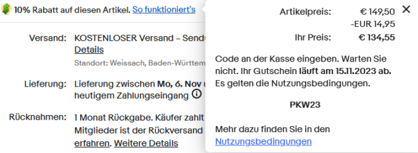 Eine sehr gute Ersparnis (32%) gibt es bei diesem Deal von Ebay!