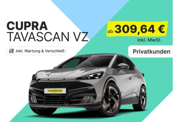 Du suchst gerade nach einem neuen, fahrbaren Untersatz? Dann könnte es durchaus sein, dass wir genau das Richtige für dich haben! 😉 Bei LeasingMarkt gibt es gerade den Cupra Tavascan VZ (340 PS, inkl. Wartung & Verschleiß) für 309,64€/Monat. Das Angebot versteht sich bei einer Laufzeit von 30 Monaten und einer jährlichen Laufleistung von 10.000 Kilometer.