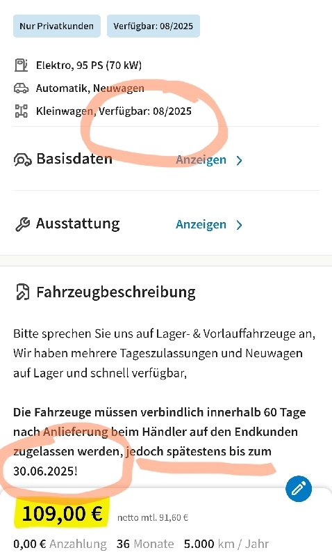 Angebot ist nicht mehr verfügbar – hat mich gewundert wie es funktionieren kann: Verfügbar ab 08/2025 ABER nur gültig bei Zulassung bis 30.06.25 ! Wie soll das funktionieren ???