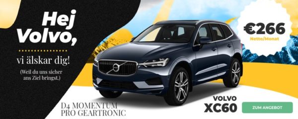 Bei Vehiculum bekommt ihr gerade den VOLVO XC60 D4 (190PS, Automatik) ab 239€/Monat (Netto). 🙂 Das Fahrzeug gibt es in 2 Laufzeit-Varianten: